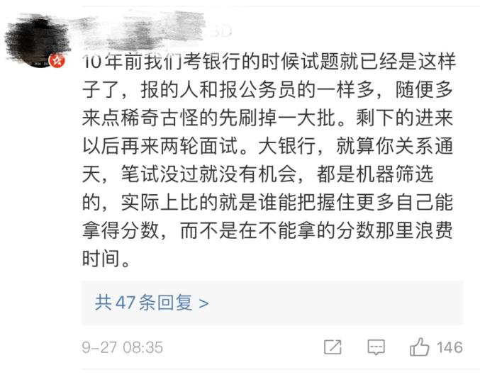 据中国证券报,一位10年前参加过银行笔试的网友坦言,“10年前的试题就已经是这样子了……实际上比的就是谁能把握住更多自己能拿的分数。”
