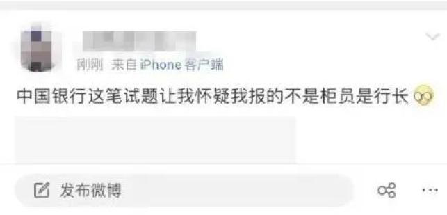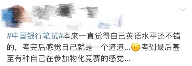对此,有网友留言表示:“我以为是在招总行行长呢!”考题太难登上热搜抱怨本次中行笔试题目难的,远不止上面这一位考生。考生们纷纷在微博上“控诉”中行“为难人”的笔试题: