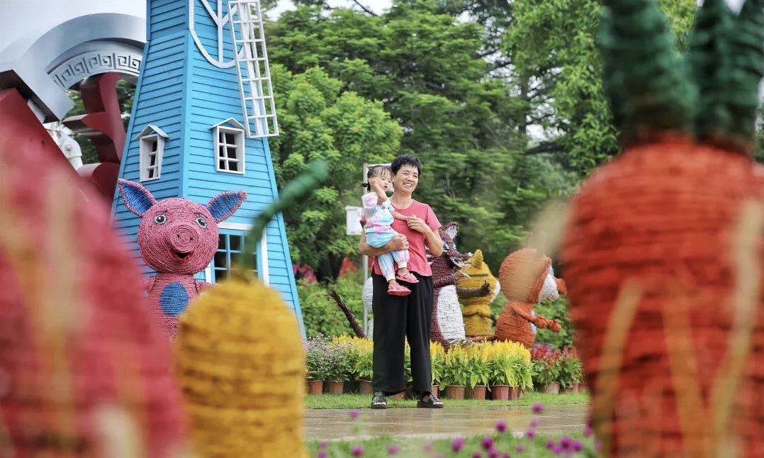 在农耕文化主题园区,正在劳作的农民,耕牛、蔬菜水果等造型也新颖别致,造型各异的稻草人展示了田间劳作最真实的一面。