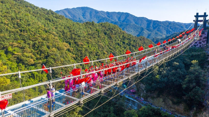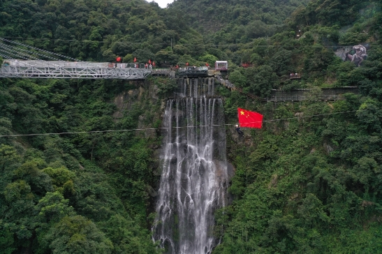 虽然过了漂流旺季,古龙峡五大爆品之一的漂流产品游客接待量比暑假有所下降,但景区的古龙大瀑布群、云天玻霸系列产品、古龙神掌、天空之梯、网红河谷这四大爆品仍然形成了超级磁场,前来挑战体验的游客川流不息,现场欢呼声、尖叫声、笑声不绝于耳。到处国旗飘扬、游客们拿着小国旗,有的脸还贴着国旗,景区的广播响起了《歌唱祖国》,很多游客也停步摇着国旗跟唱起来,气氛非常祥和。