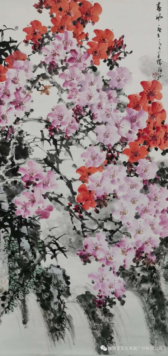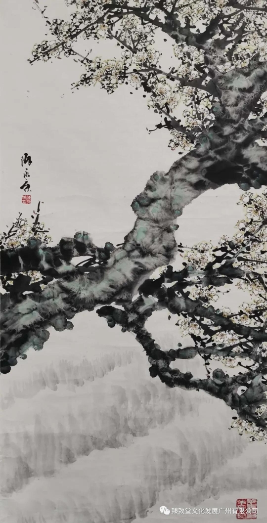 陈永康也介绍道,羊城九老其实是各有所长,师承岭南宗师,又发展出自己的个人特色。好像他自己就取了一些海派的构图趣味,但造型又保留岭南的细腻造型,其中在他的一幅梨花,枝杆用泼墨的大写意画法,加入石绿撞粉,梨花则是细致勾勒,梨花一枝春带雨,润物无声。