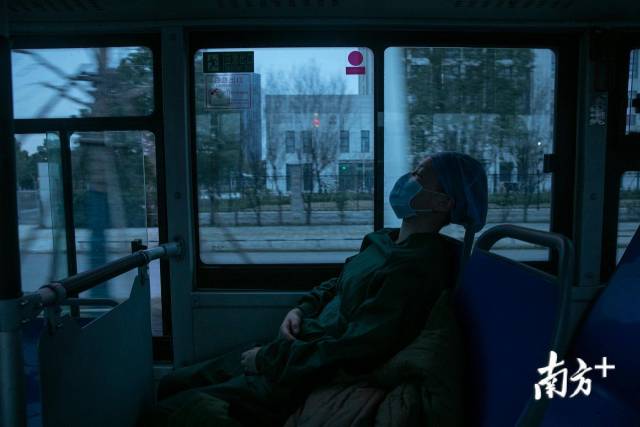 2月24日晚,开往武汉客厅方舱医院的路上,窗外行人稀少,晕车的她上车后闭目养神。