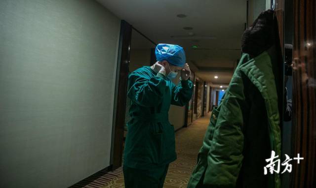 2月24日,出门前,刘家怡在酒店走廊换上干净的口罩。