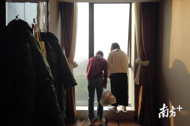 2月23日,武汉天气转晴,刘家怡和同事出门打饭经过窗边停下脚步。