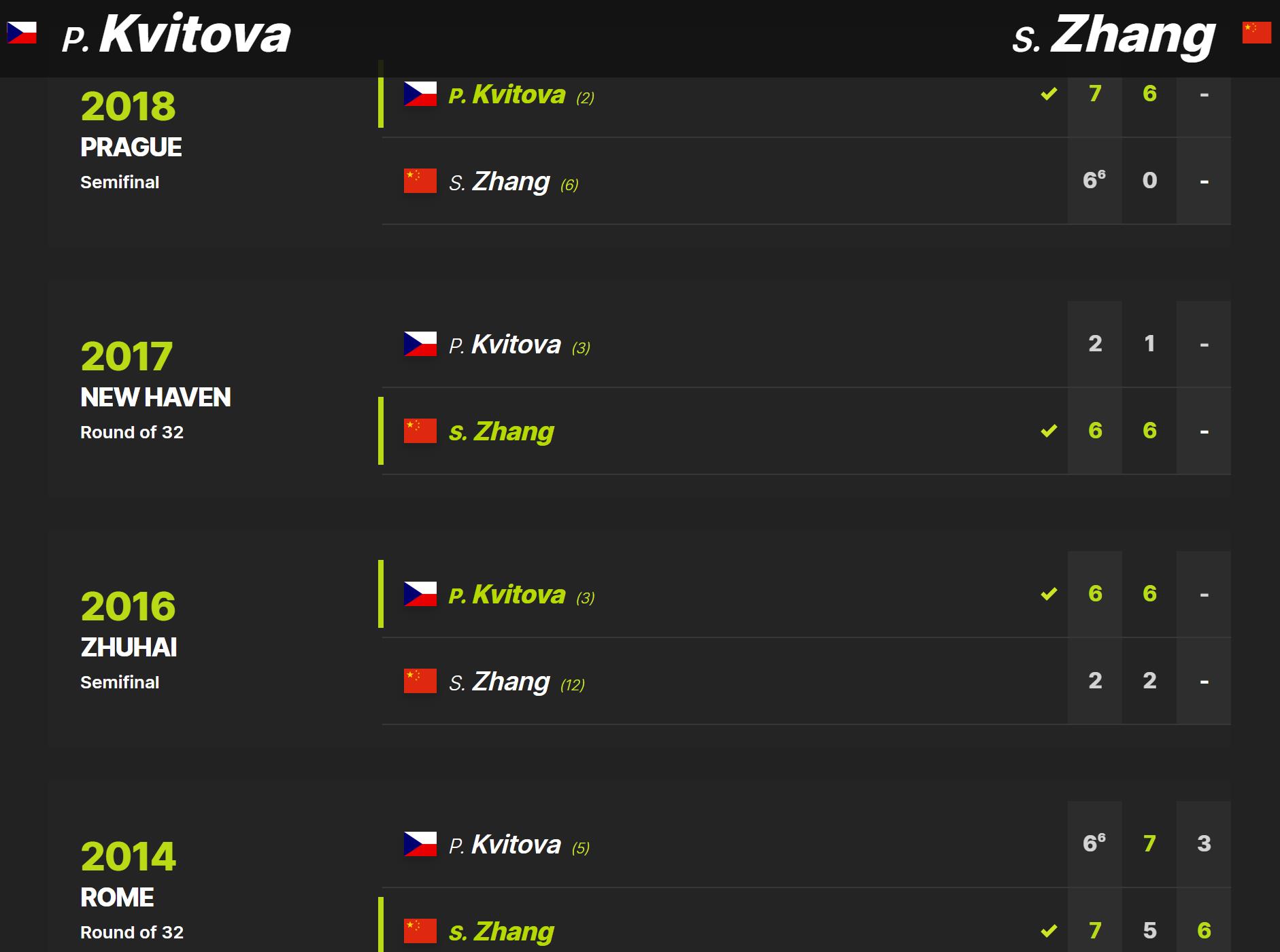 科维托娃和张帅有过5次交锋记录,捷克姑娘以3胜2负占优,不过,两人从未取得过连胜。最近一次交手是在2018年布拉格公开赛半决赛,科维托娃2比0胜出;而张帅上一次击败科维托娃要追溯到2017年纽黑文赛1/16决赛,当时仅让对手拿下3局就轻松胜出。