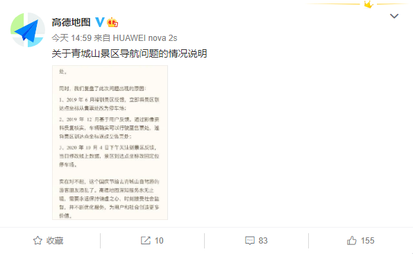 声明发出后不久,青城山-都江堰景区官方微博也回应称,高德地图方已主动联系景区,并及时修改了前往青城前山的定位及线路导航,请游客朋友们放心使用。