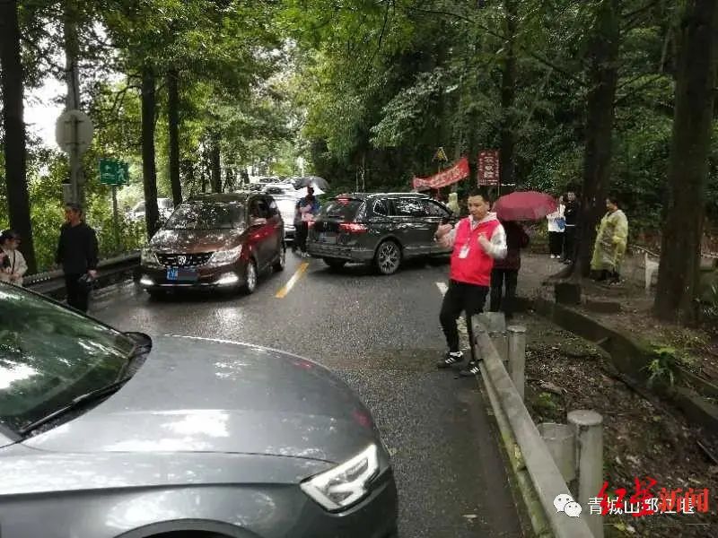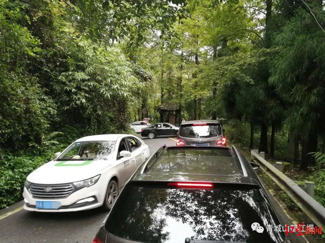 披露的图片显示,几辆汽车在青城山景区内,有的横在路上,有的亮着后车灯,与行人拥挤在一起,戴着工牌的人员在一旁指挥交通。