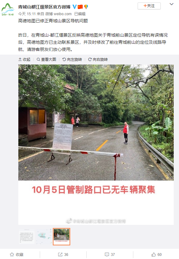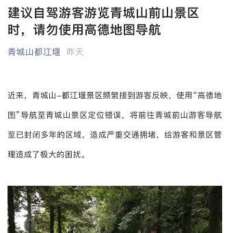 10月4日下午,青城山都江堰景区官方公众号“青城山都江堰”发文称,近来,青城山都江堰景区频繁接到游客反映,使用“高德地图”导航至青城山景区定位错误,将前往青城前山游客导航至已封闭多年的区域,造成严重交通拥堵,给游客和景区管理造成了极大的困扰。