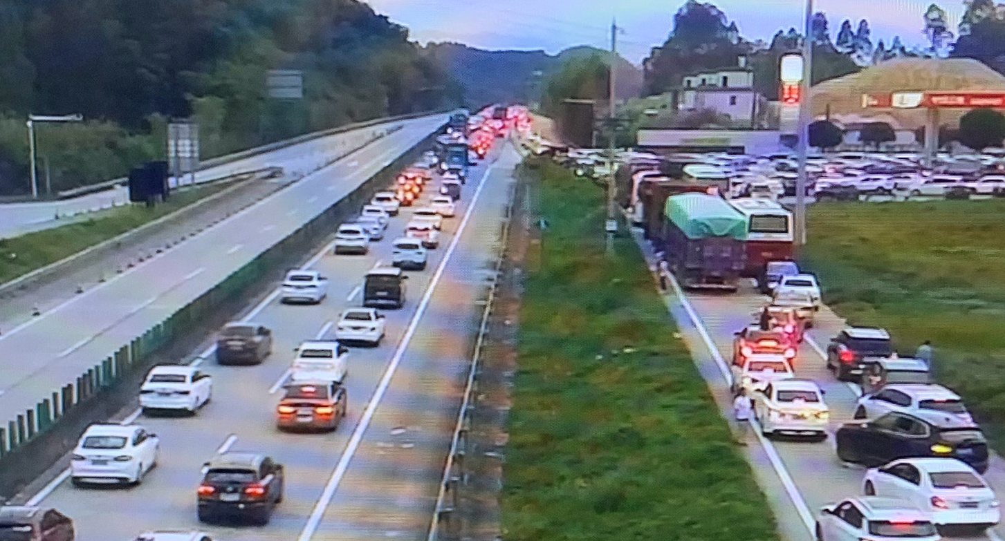 到昨天下午18时,许广高速清远段南行车流密集,南行清新服务区至龙颈路段车辆饱和。如需加油、休息请从就近出口驶离到地方公路加油站。