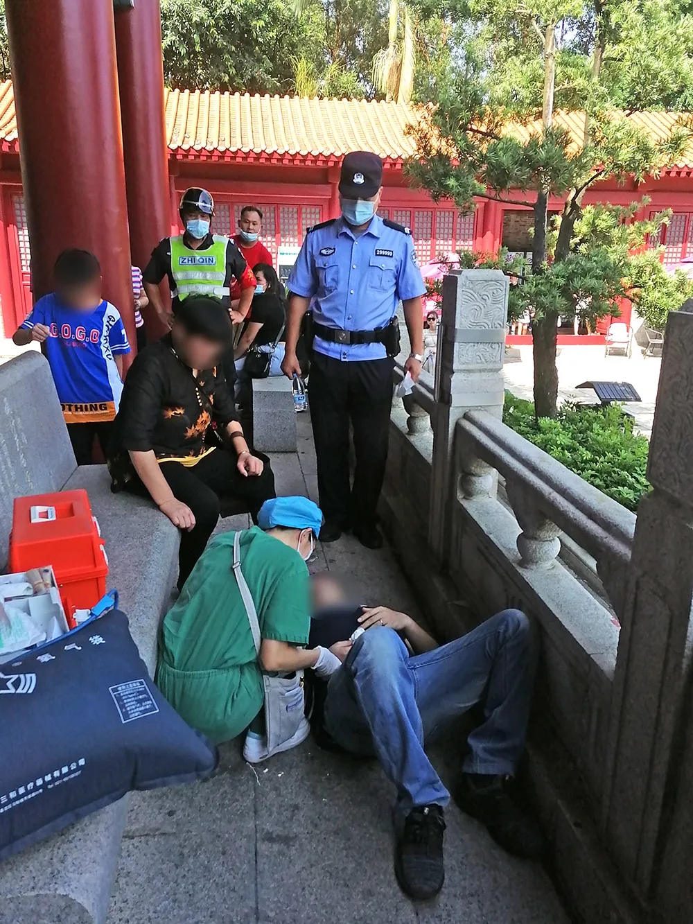 就在这时,有群众赶来向民警反映,在正殿下方台阶处又发现一名女性游客出现中暑症状。在确保正殿处男游客基本安全后,民警曾昭鹏又带领2名警力前往下方台阶,对女游客进行救援。民警到场后,该名女游客瘫坐在台阶处,并有呕吐症状,嘴唇发白。经询问周边群众,得知该女游客一直在游玩,未吃午餐。民警判断女游客应该是低血糖加上天气炎热产生脱水症状。民警随即将女游客转移到旁边阴凉位置,为其扇风、擦汗,并提供饮用水,同时守护着其等待“120”医护人员到场处置。