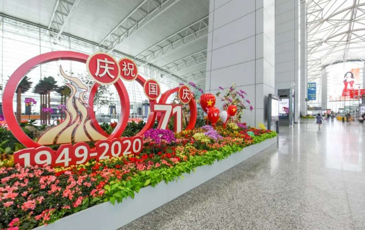 在二号航站楼F岛附近的“跨月宫”主题长廊里,“月宫造景”、“中秋许愿树”、“玉兔奔月”三个拍照打卡点大受欢迎。D岛岛头用1.2万枝玫瑰组成30平方米国旗造型花墙,H岛中庭则布置了中国传统建筑风格与醒狮相结合的国庆主题拍照背景打卡点,加上屏风、灯笼等设计做辅助,旅客在科技感十足的机场也能体会中国传统元素的美。到达大厅的旅客休息区,也设置了拱形灯光花艺装饰及绿植花架。