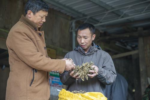 在重庆市南川区山王坪镇庙坝村,村民张廷刚(右)跟药贩一起检查出售的黄连品质(9月28日摄)。