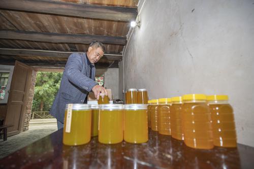 在重庆市南川区山王坪镇庙坝村,村民夏春学在包装蜂蜜(9月28日摄)。