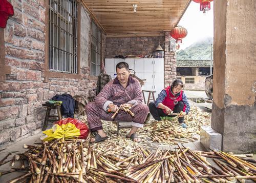 在重庆市南川区山王坪镇庙坝村,村民田应权和妻子李正蓉将新采摘的竹笋去壳(9月28日摄)。
