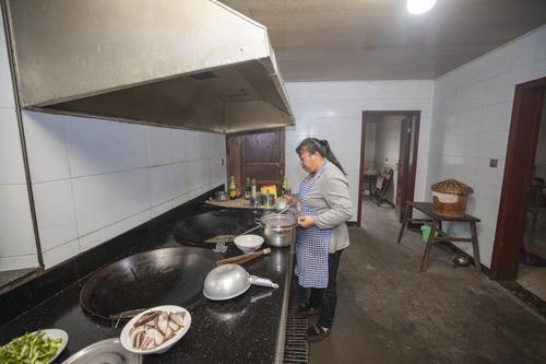 在重庆市南川区山王坪镇庙坝村,村民郑洪琴在自家经营的农家乐内为游客做饭(9月28日摄)。