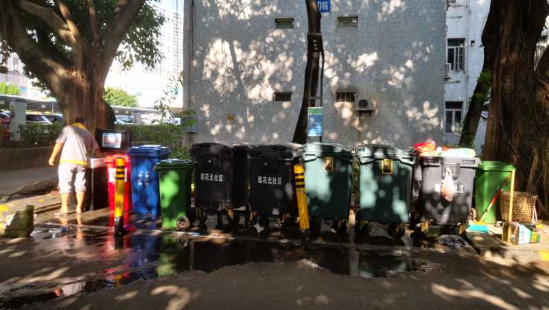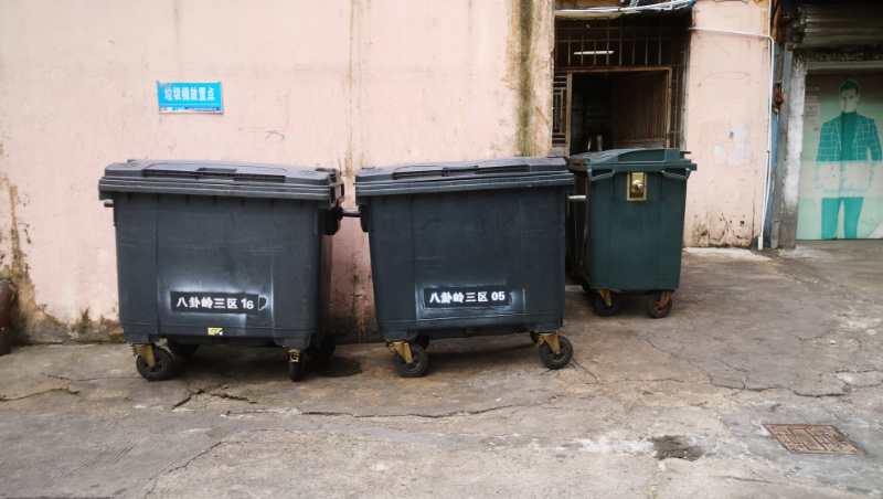 而相隔一条八卦一路的八卦岭610栋附近的八卦岭三区,则没有设置得这么认真。灰色的可推拉式垃圾箱分布在很多旧厂房楼下,记者看到垃圾箱上除了部分喷涂了“其他垃圾”外,剩下的都只喷涂了“八卦岭三区”字样。据附近人员介绍,由于这里基本上是食肆和企业,垃圾相对单一,厨余垃圾都会被专门的人用蓝桶收走,剩下的生活垃圾不多,而能够扔入垃圾桶的大多数是废弃的包装。