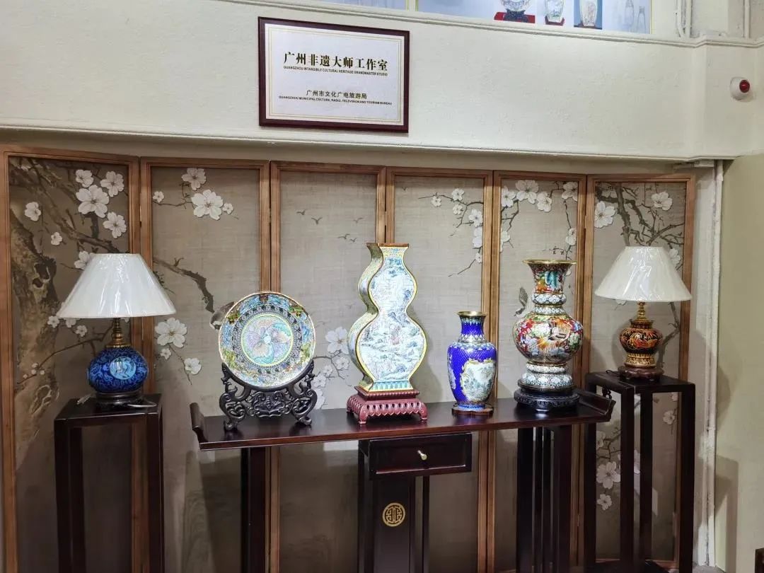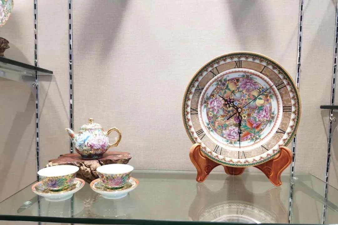 这里展出的广州珐琅注重运用中国工笔重彩,绘饰青山绿水、虫鱼鸟兽、仕女和书法题字等,工艺精湛,造型古朴,构图严谨,色彩和谐,整体风格古典淡雅,且有现代感。