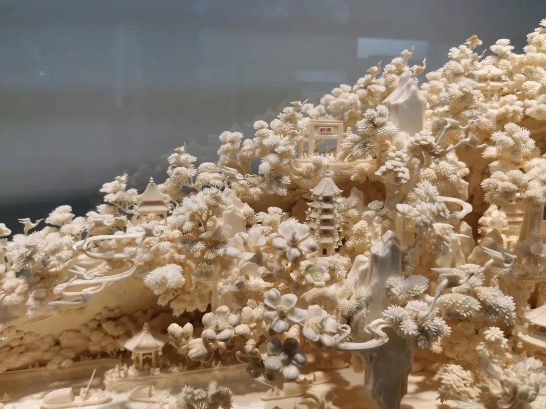 由于国际禁止象牙贸易,同时为了保护生态环境,荔湾区牙雕国家级传承人张民辉大师另辟蹊径,采用猛犸象牙、水牛骨、河马牙等,代替牙雕传承技艺。在这里,你可以看到人物、动物、山水、楼台、宫灯、牙球等各类牙雕题材。