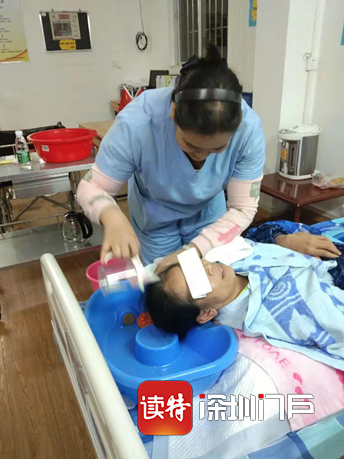 养老护理员为失能老人洗头(摄于2019年)
