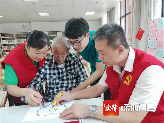 2019年9月30日,工作人员作为党员志愿者陪伴长者进行迎国庆手绘活动