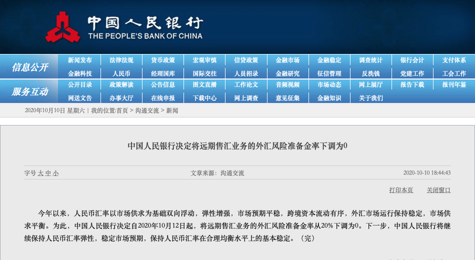 10月10日,央行发布消息称,今年以来,人民币汇率以市场供求为基础双向浮动,弹性增强,市场预期平稳,跨境资本流动有序,外汇市场运行保持稳定,市场供求平衡。为此,中国人民银行决定自2020年10月12日起,将远期售汇业务的外汇风险准备金率从20%下调为0。