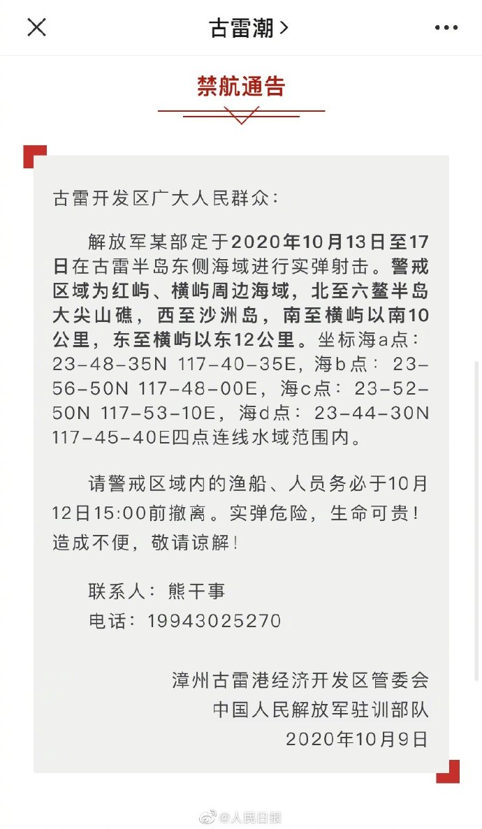 10日,福建漳州古雷港经济开发区管理委员会在其官方公众号发布禁航通告:解放军某部定于2020年10月13日至17日在古雷半岛东侧海域进行实弹射击。请警戒区域内的渔船、人员务必于10月12日15:00前撤离。