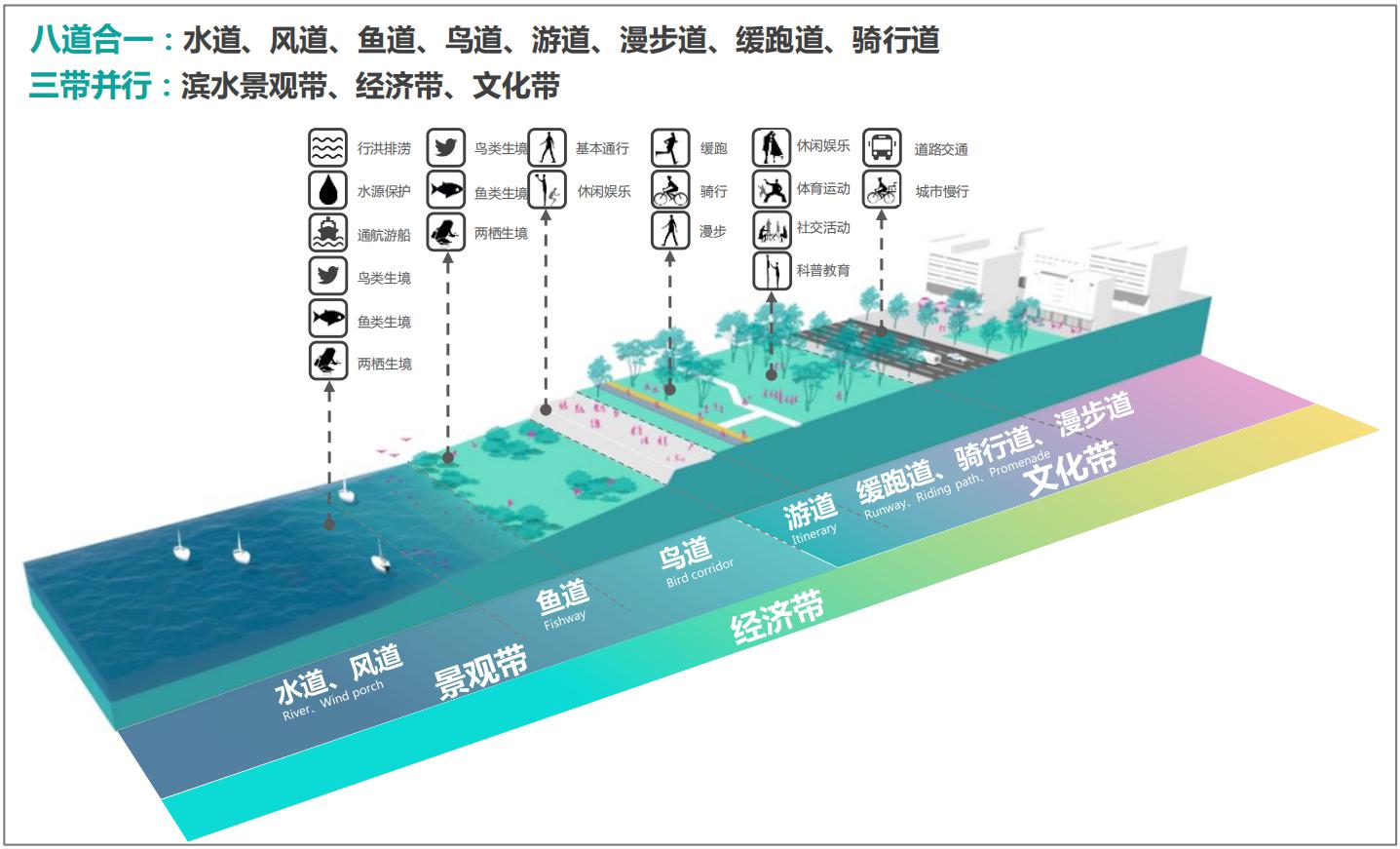 高点站位,创新“八道三带、综合治理”碧道内涵 。广州市积极探索新时期碧道建设时代内涵,将碧道建设作为城市治水升级版,实现从单纯治水到城市综合治理,还清于水、还水于民、还绿于岸,以水而定、量水而行,统筹山水林田湖海综合治理、系统治理、源头治理,改善流域生态环境、实现空间综合利用、带动产业转型升级、激活片区多元价值,并结合自身实际,深化细化省万里碧道“三道一带”空间要求,提出“水道、风道、鱼道、鸟道、游道、漫步道、缓跑道、骑行道”八道合一和“滨水经济带、文化带、景观带”三带并行的“八道三带”空间范式,保护珠江生态岛链、建设碧道风廊、水鸟走廊,恢复鱼类洄游生态圈,打造蓝线上的公共服务综合带,实现堤内外、上下游、干支流、左右岸系统治理,形成广东碧道建设的“广州方案”。