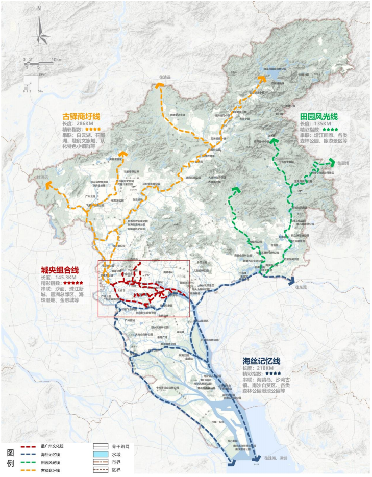 规划中提出,参照波士顿“自由之路”“翡翠项链”经验做法,以碧道沿线历史文化、生态资源、公共活动空间为基础,综合考虑资源位置、文化特色、生态效益、交通条件、建设条件等,策划了四片多条碧道主题特色游径,串联一批最能体现“广州味道”的文化资源、生态资源、活动空间,诉说广州故事,展示广州魅力。