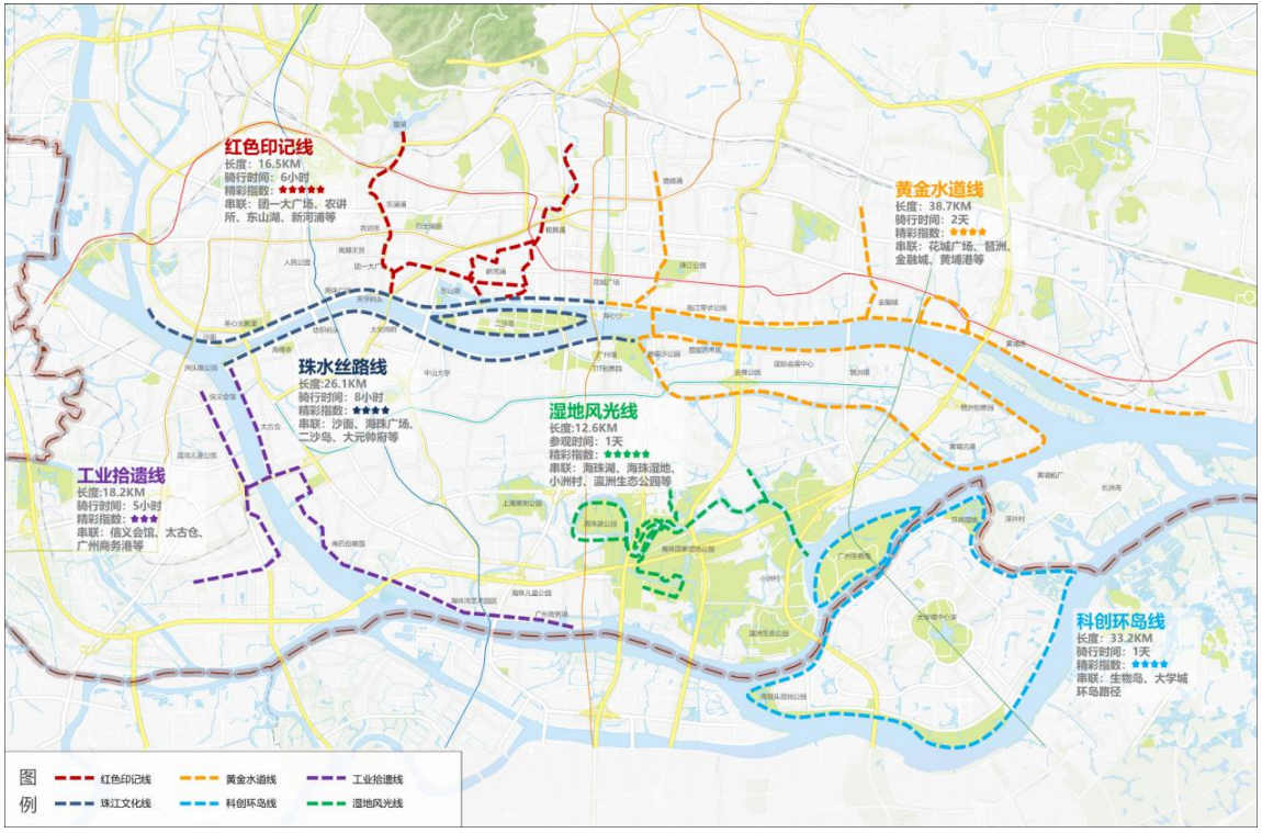 16.5公里,主要沿新河浦碧道及东濠涌碧道,串联团一大广场、农讲所、东山湖、新河浦等红色历史遗址,回溯岭南革命策源地,讲述红色文化历史;珠水丝路线,26.1公里,主要沿珠江前航道,串联沙面、海珠广场、二沙岛、大元帅府等,观摩珠江两岸近代雄伟建筑,展示广州作为海丝之路主港的辉煌历史;湿地风光线,12.6公里,主要沿海珠湖碧道、海珠湿地碧道,海珠湖、海珠湿地、小洲村、瀛洲生态公园等,感受城央最美自然生态;黄金水道线,38.7公里,主要沿珠江前航道天河段、猎德涌、琶洲涌、黄埔涌等,串联珠江新城、国际金融城、琶洲互联网集聚区等城市重要经济产业片区;工业拾遗线,18.2公里,主要沿珠江后航道碧道,串联信义会馆、太古仓、广州商务港、广钢遗址、广船遗址等,见证广州近现代工业的奋斗历程;科创环岛线,33.2公里,主要沿生物岛环岛碧道、大学城环岛碧道,串联生物岛、大学城环岛路径。