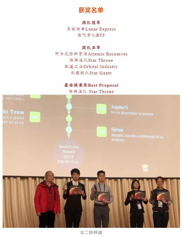 最终,陈飞宇队BTF所在公司“月球快车”的设计获得了评委的一致好评,荣获全国冠军,陈梓涵队Star Throne所在公司“阿尔忒弥斯资源”和刘理航队Star Gazer所在公司“轨道工业”表现不俗,均获得本次比赛的全国亚军。