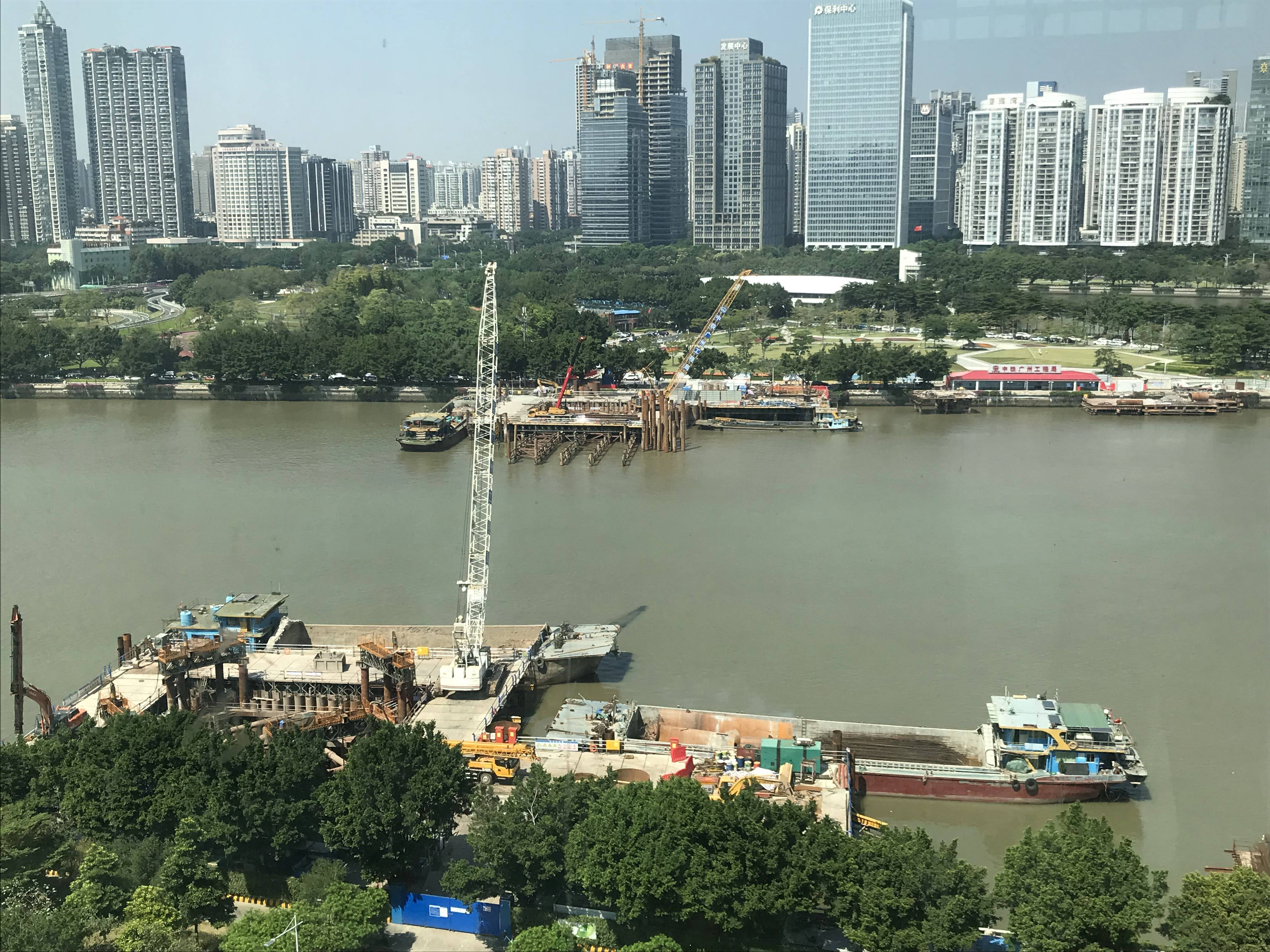 记者在施工现场看到,珠江两侧都搭建了作业平台,并有作业船舶停留,工人们在紧张地施工中。广州塔南广场配建珠江两岸人行景观桥项目的建设单位为广州市建设投资发展有限公司,项目北起二沙岛、南至珠江南岸阅江西路,建设规模为436米。合同工期为2020年5月1日至2021年6月15日,总计380天。