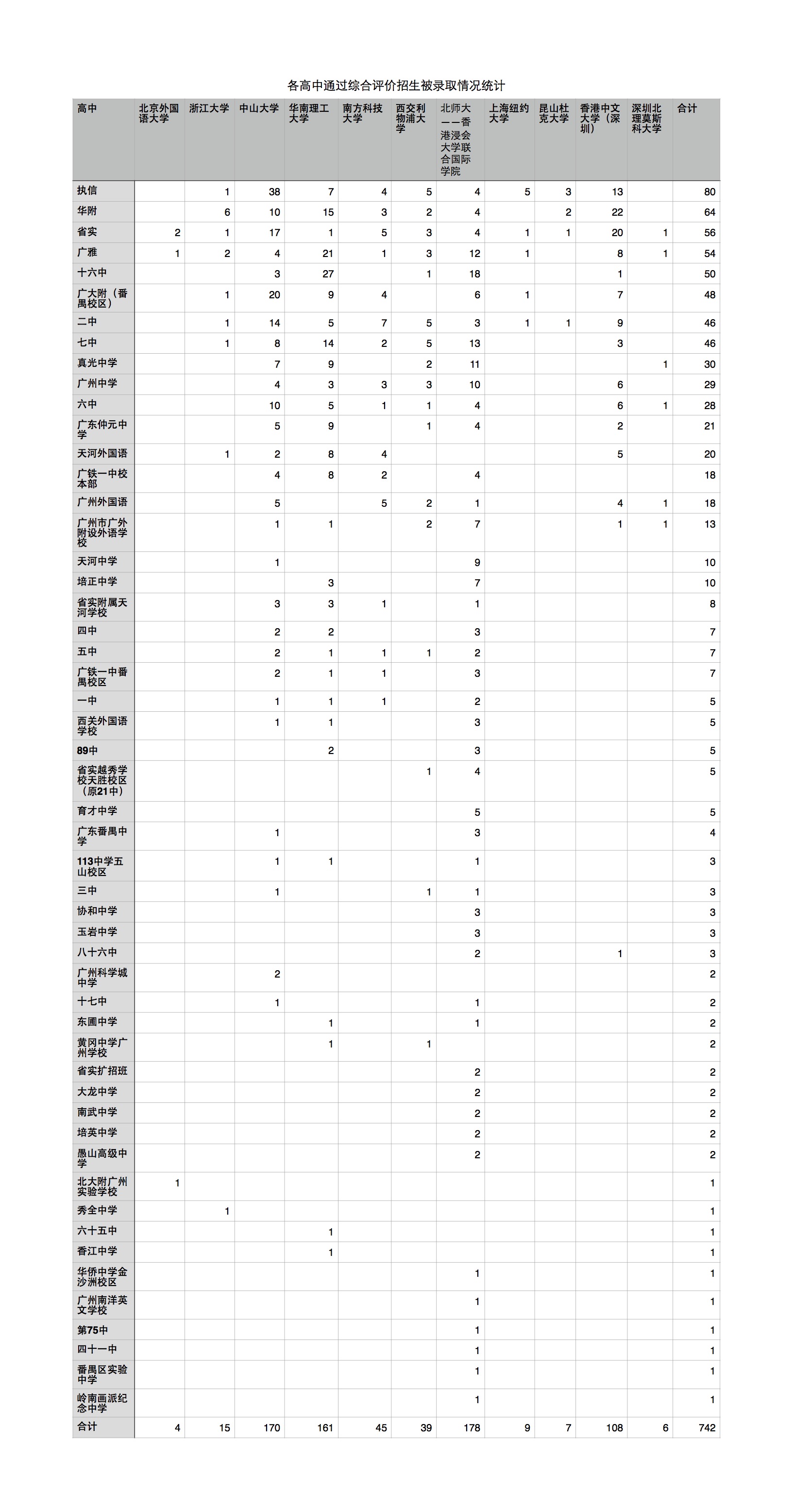 11所高校一共录取1878名考生,其中广州市录取742人,占比超39%。具体情况如下: