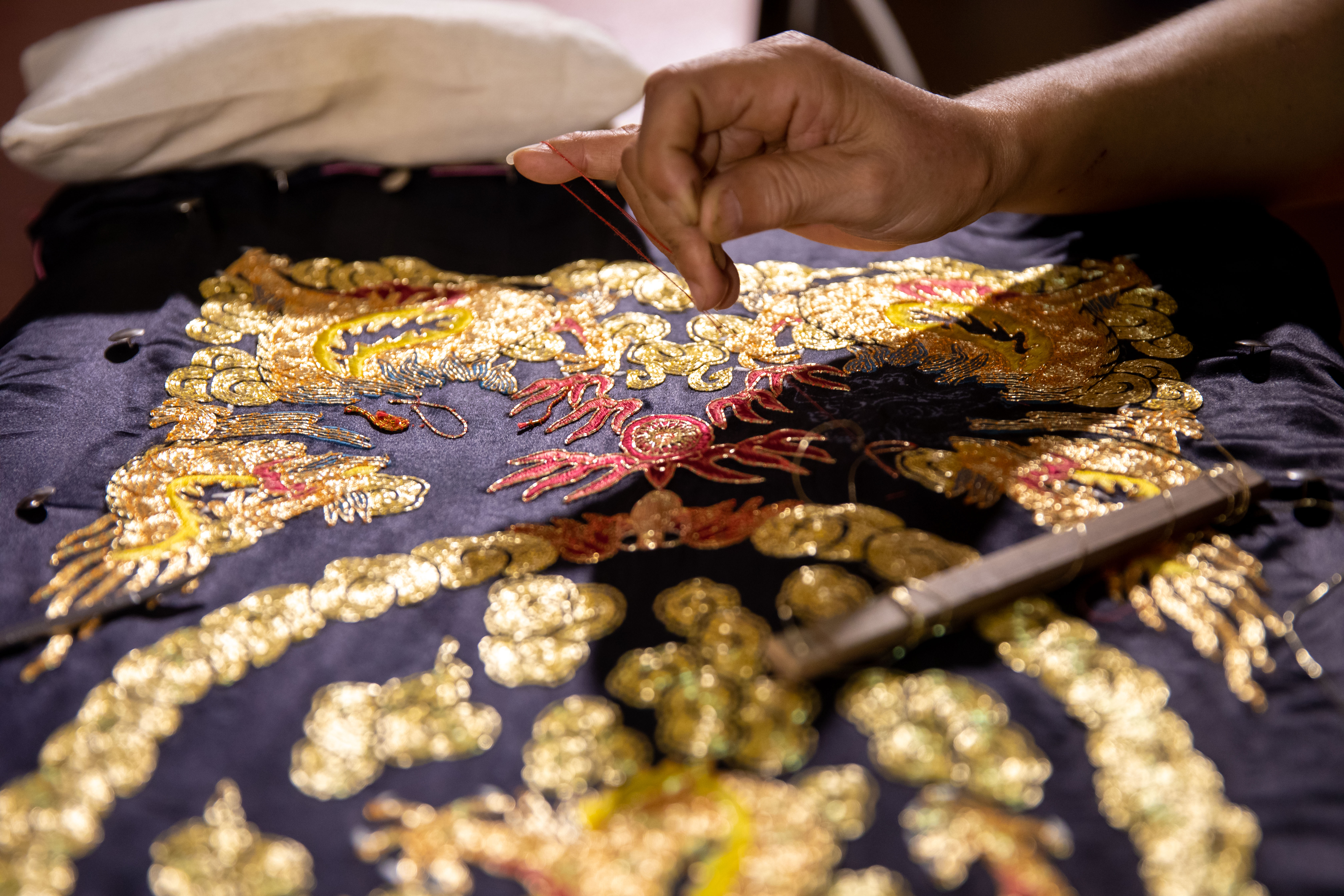 除了展示工艺品,潮州汇馆同时还是“非遗工艺美术潮绣传习基地”。陈泽瑶透露,她收了十来个学生,孩子们周末就来学潮绣,“他们大部分不是潮州人,有的甚至是进店买衣服的时候突然萌生学潮绣的念头。我会问他们:是你妈妈让你来学,还是自己想来学的?如果是妈妈让你来学,我就不教,如果是自己想学,我就教”。开班授课,陈泽瑶的目标很明确,“我们想让更多的人认识潮绣,喜欢潮绣,把这些传统文化传承下去”。