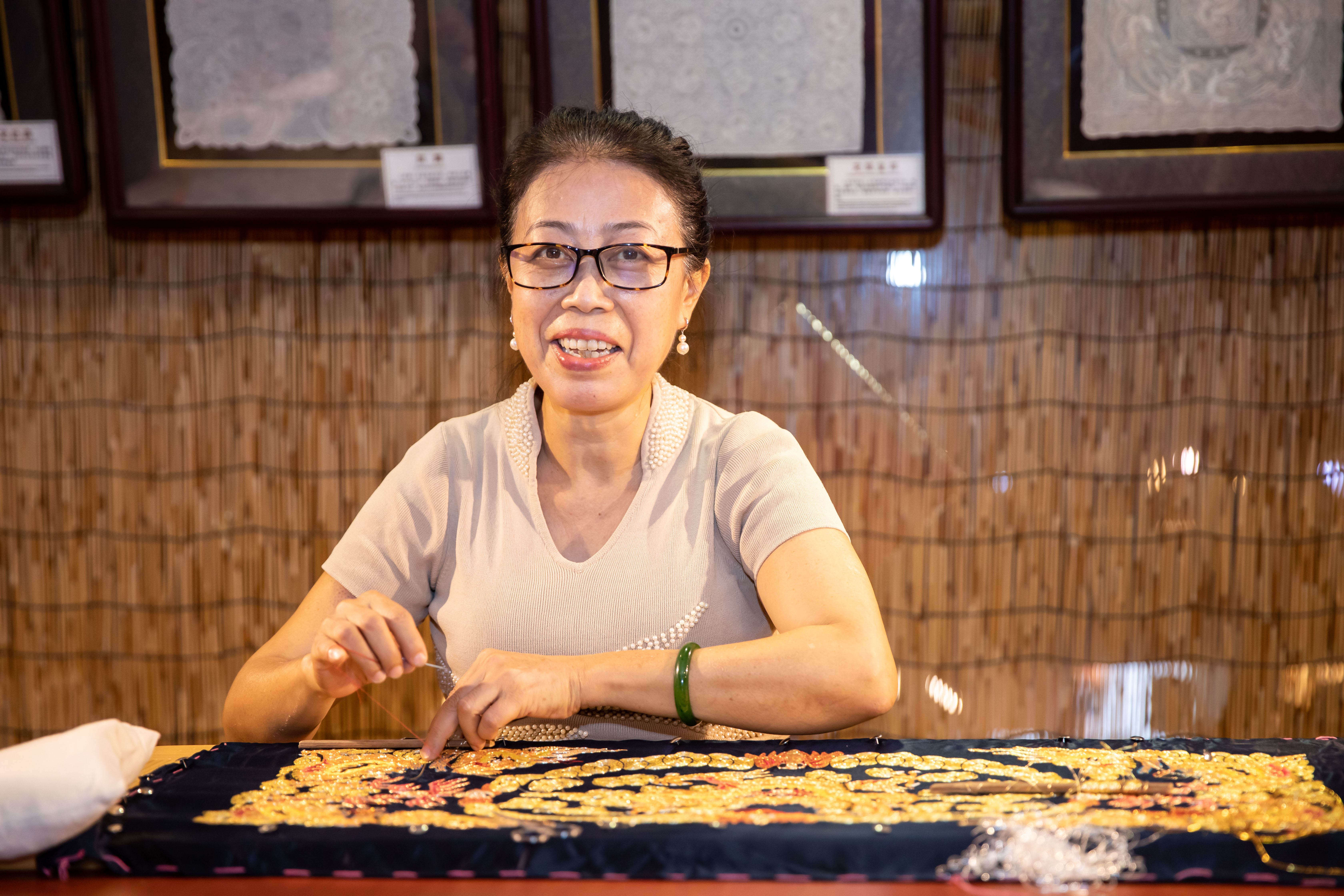 现在,广州市民想要一睹潮绣精品,不用跑到潮州——在北京路老字号一条街“藏”着一家潮州汇馆,它同时也是潮绣抽纱博物馆以及广州市工艺美术培训潮绣基地,里面展示着当代潮绣最高工艺水准的作品。