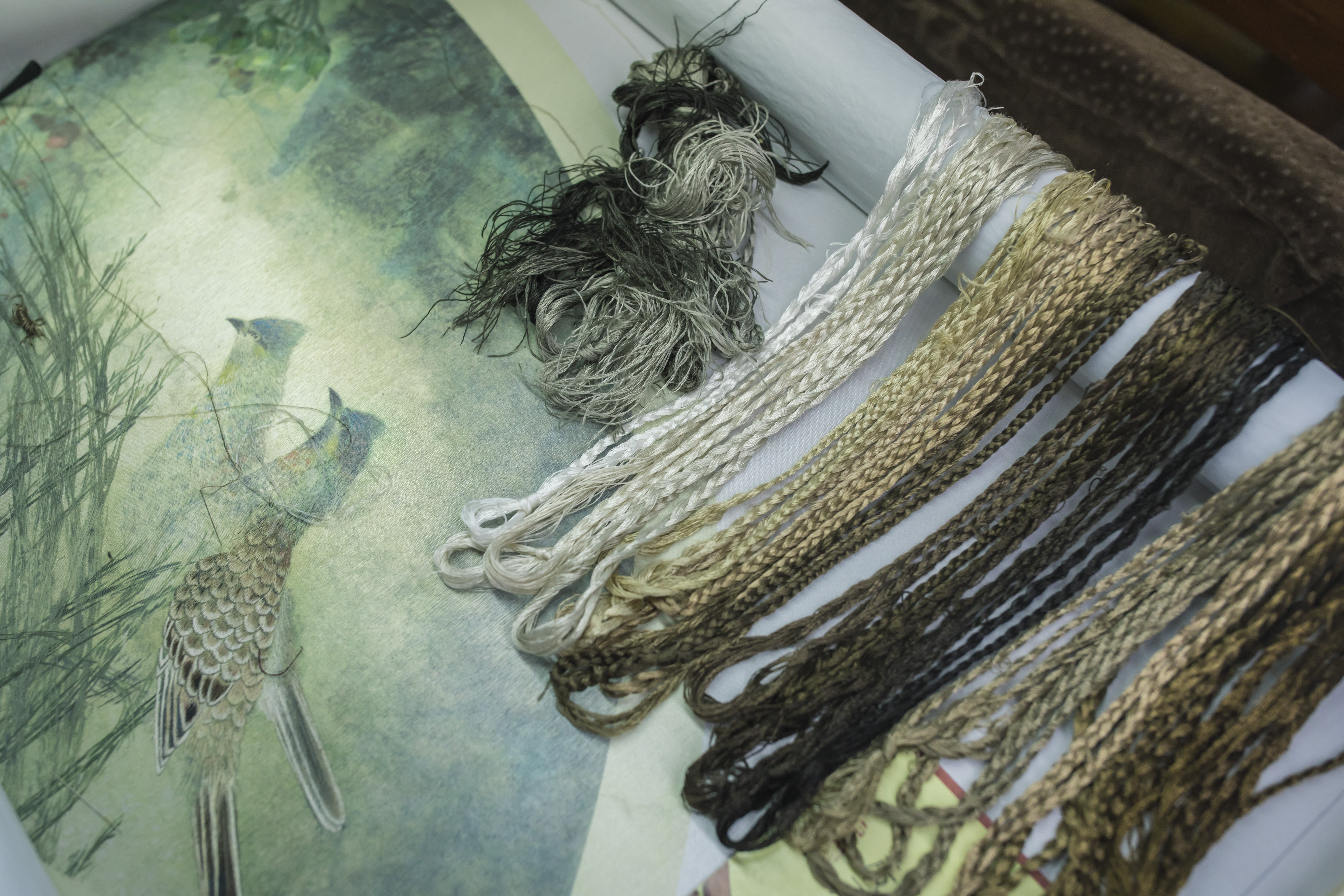 创作中的广绣作品。 陈忧子 摄潮绣以戏服为主。它以布局满、图案繁茂、场面热烈、用色富丽、对比强烈、大红大绿而著称。其最大的特点就是布局满,往往少有空隙,即使有空隙,也要用山水草地树根等补充,显得热闹而紧凑。