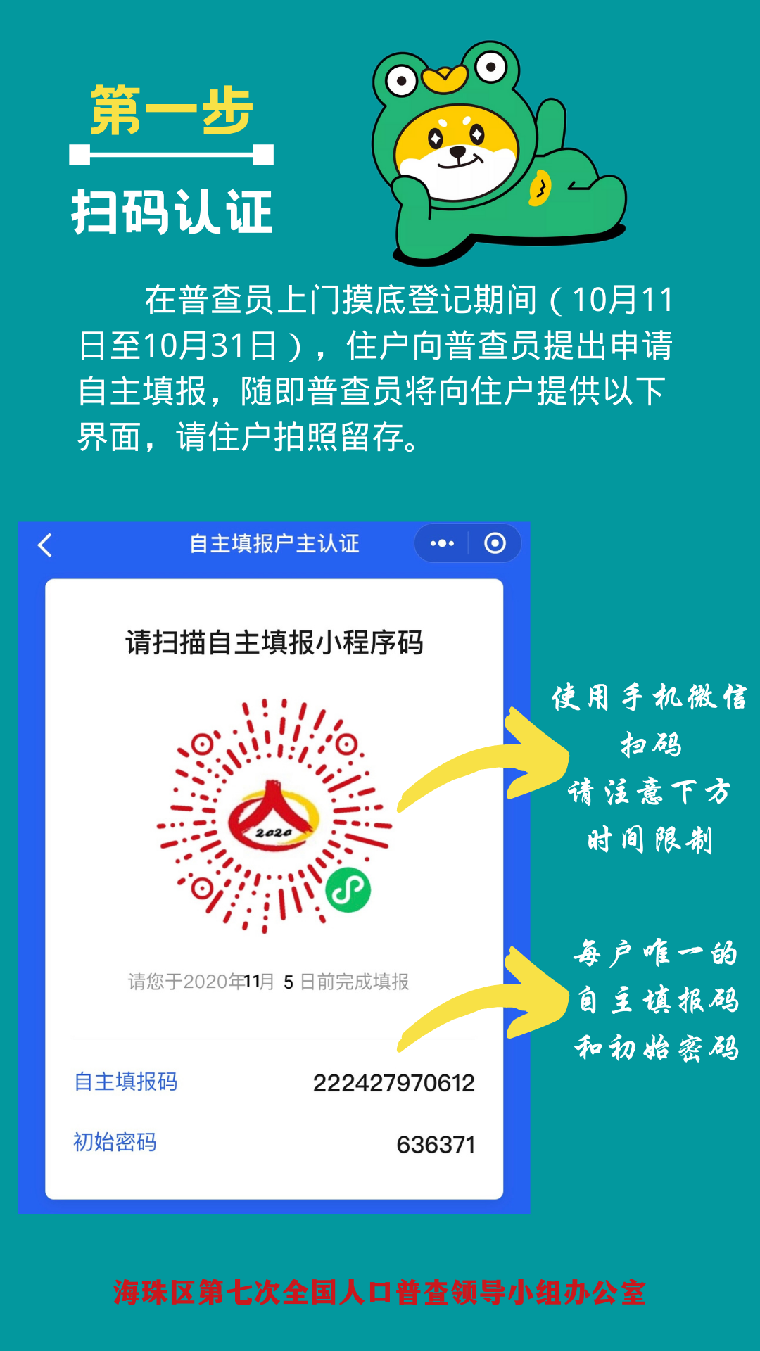 2020.10.11-10.31摸底调查自主申报:居民可如实向普查员申报住户人口基础信息,选择申报方式。