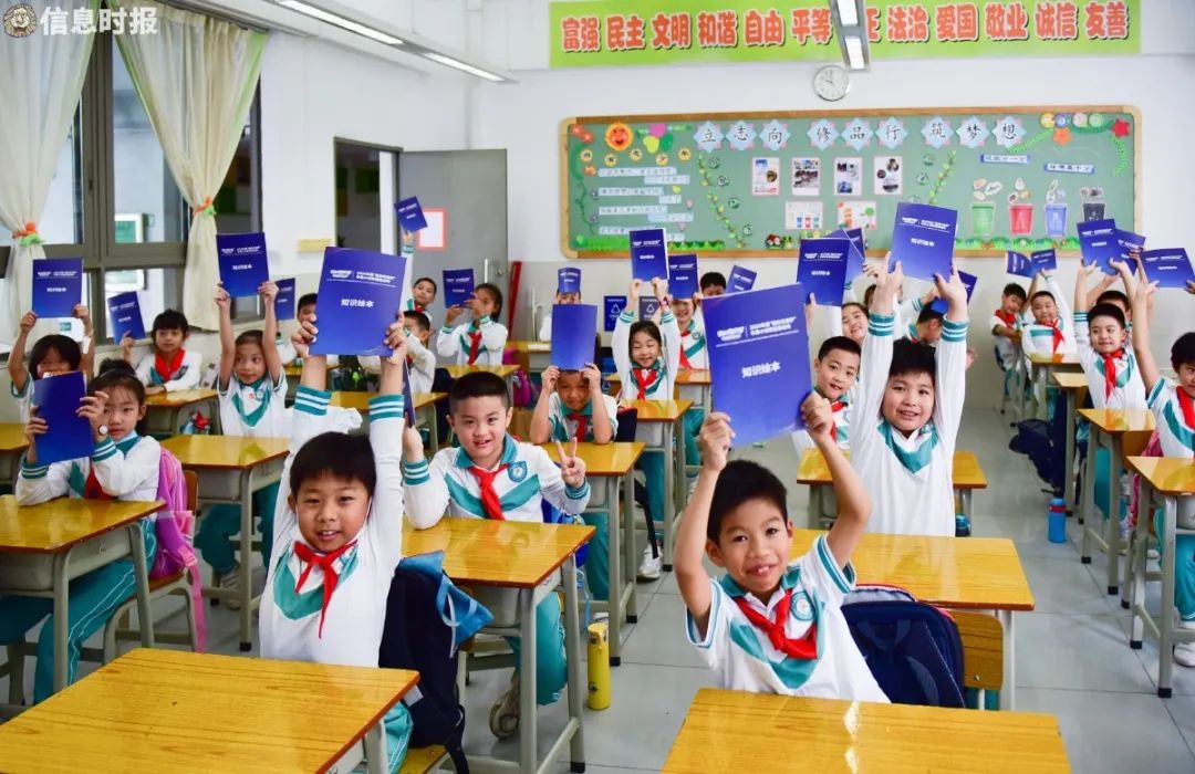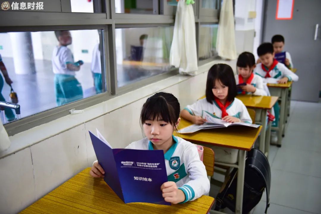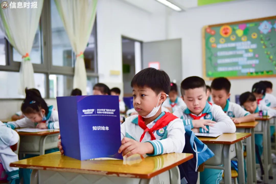 在体育东路小学海明学校的启动仪式上,每个班级都派了一名学生代表上台领取冬奥知识绘本。