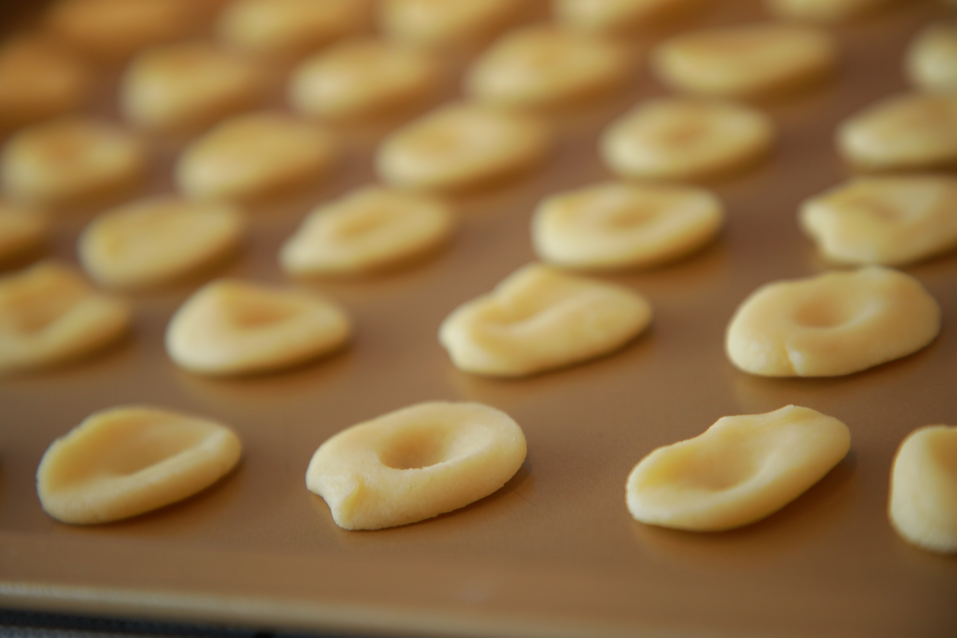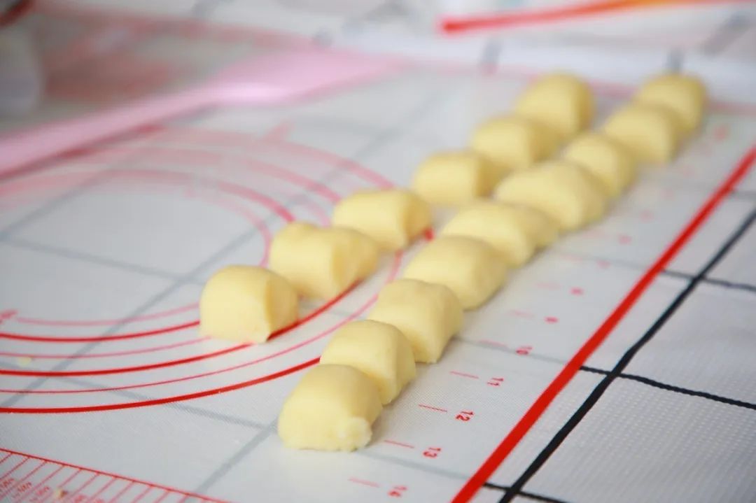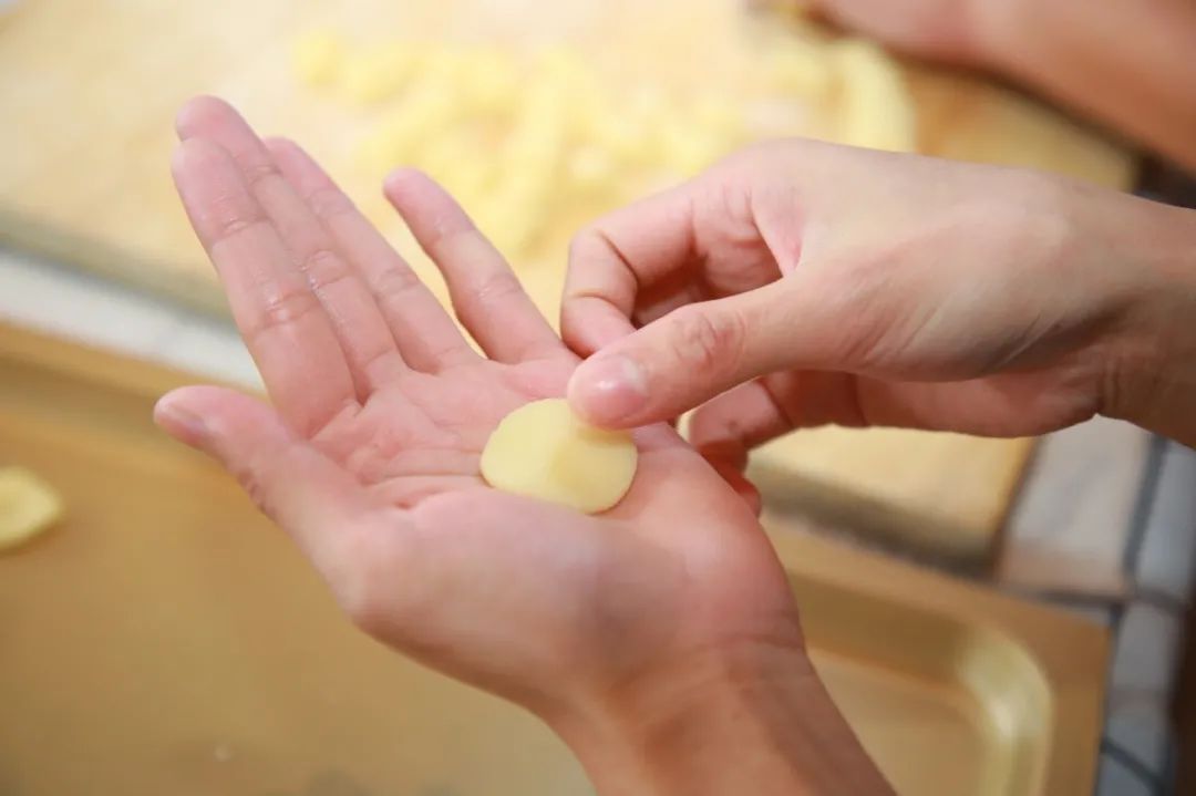 4.再取一团面团,搓成条状,按一件7克来切割。每7克的小面团在手中稍微揉圆,微微压一下,用大拇指轻压出饼状,再在中间戳一个拇指印。