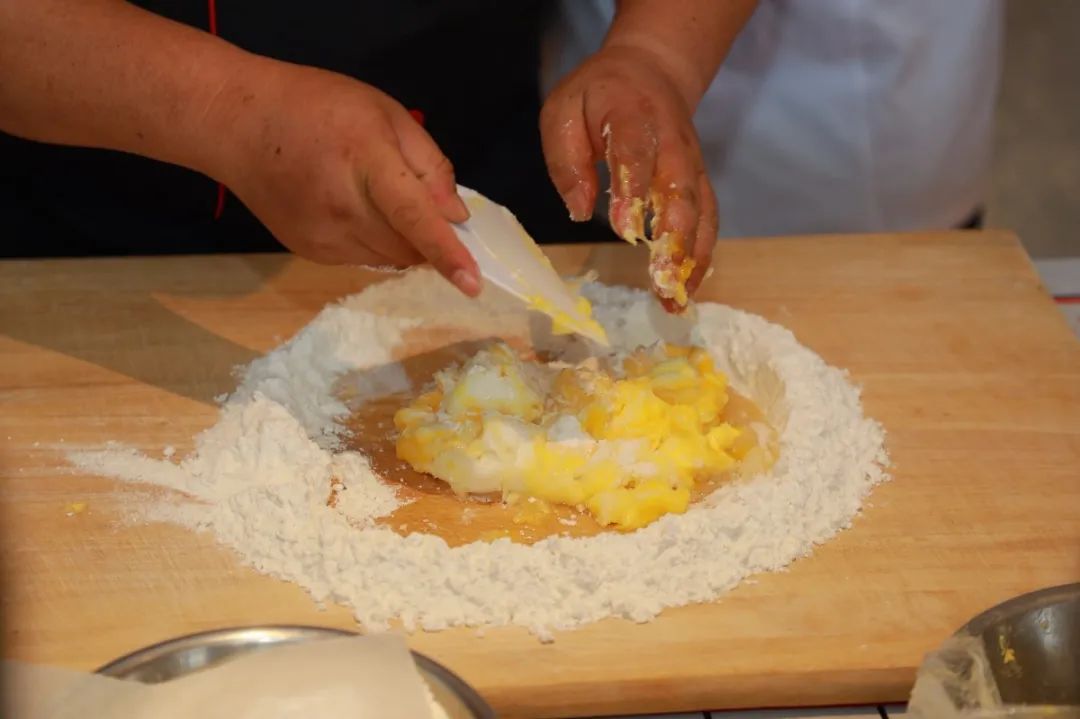 2.在“窝”中放溴粉、石粉、鸡蛋、细砂糖、牛油和猪油,将这6种材料充分搅拌匀称,但要特别注意不能掺和到面粉。等6种材料匀称后,再把面粉混合进来。
