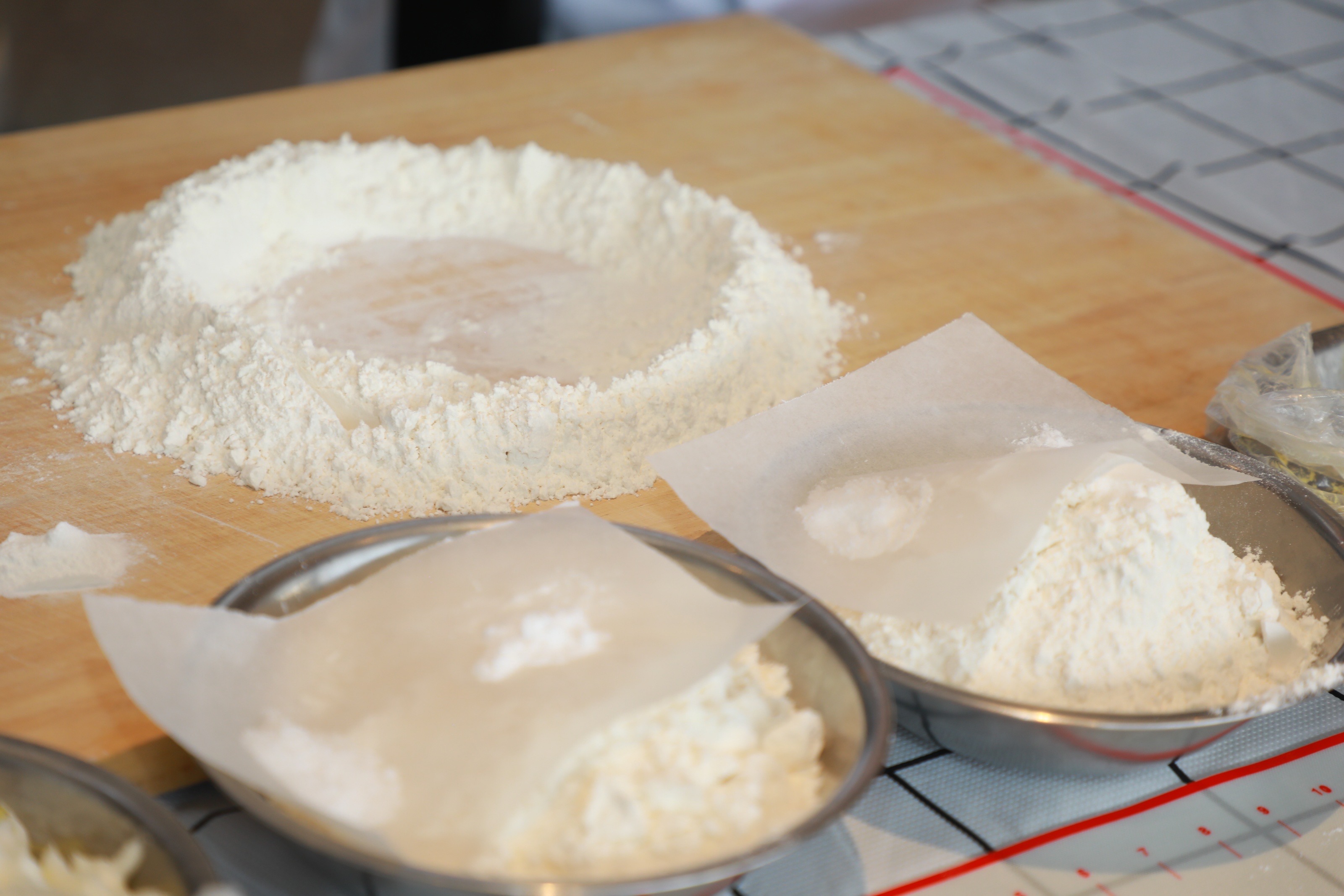 1.先将500克面粉和4克泡打粉充分混合。后用塑料刮刀在面粉堆中间划圆开“窝”。令面粉围绕在“窝”的四周。