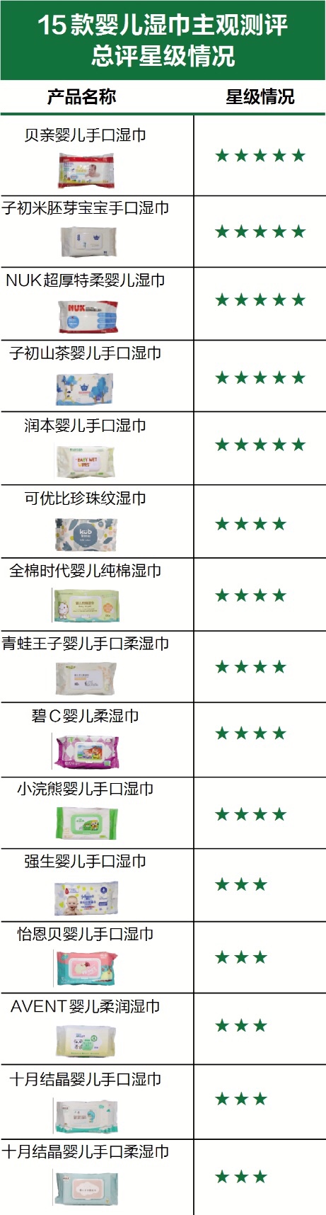 为了解婴幼儿湿巾行业整体质量状况,帮助消费者了解市场情况,日前深圳市质量协会委托深圳市品质消费研究院对市面上15款国产和进口婴幼儿品牌湿巾进行了对比测评。结果显示,在15款婴幼儿湿巾中,子初米胚芽、子初山茶、和润本等三款国货品牌产品与贝亲、NUK等两大国际品牌并驾齐驱,同获最高5星评级。