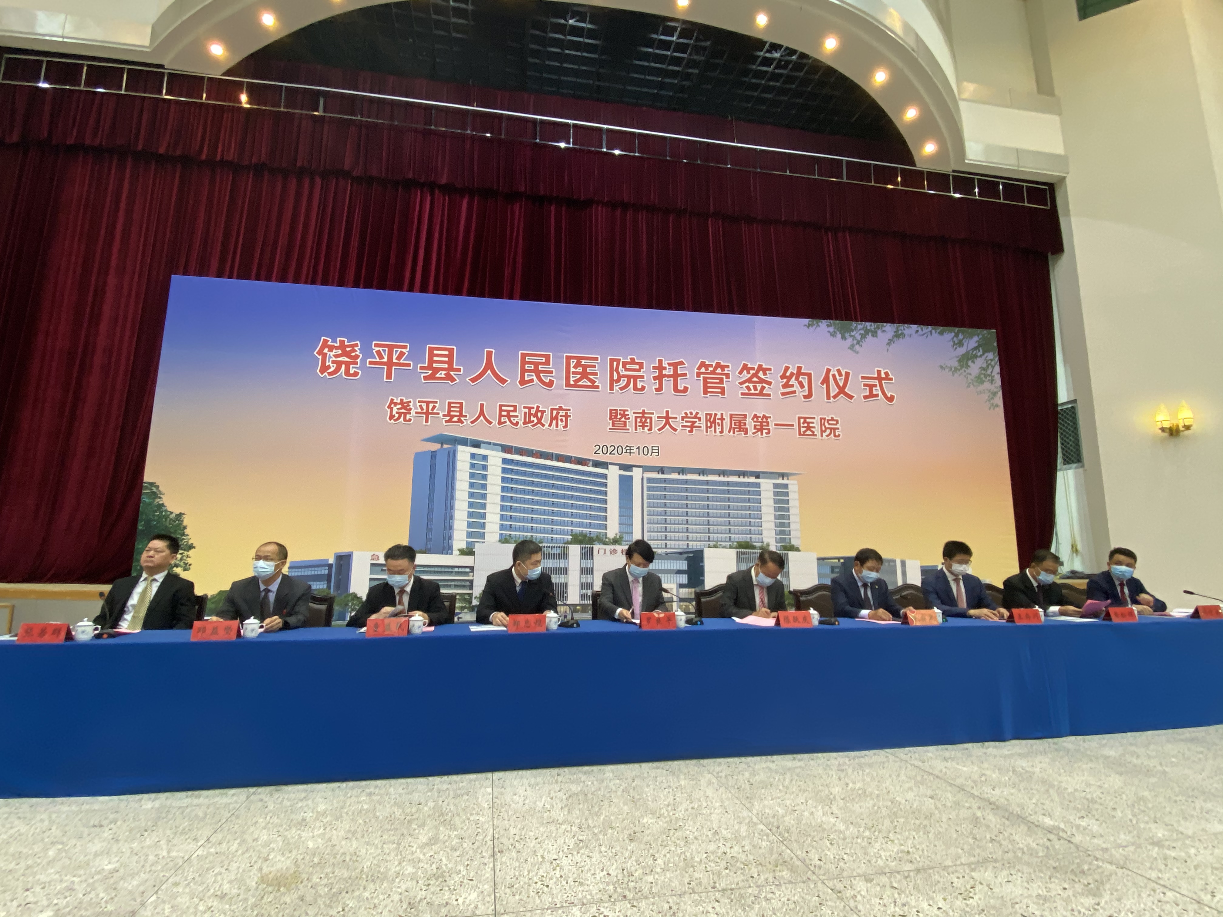 10月15日,暨南大学附属第一医院与饶平县人民政府在饶平县举行托管饶平县人民医院协议签约仪式。饶平县人民医院将纳入暨大附一院整体发展战略,成为其中重要的一环。暨南大学附属第一医院院长徐安定介绍,托管合作采取分步措施,先行派出托管小组,再派医疗专家,专家派驻方式将采用固定常驻、柔性帮扶相结合的形式,将派出20余名专家团队常驻饶平县人民医院,并根据饶平县人民医院的发展实际需求定期派出专家前往饶平县指导工作。