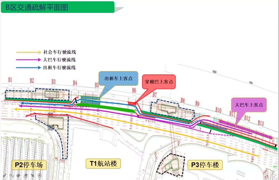 ● 大巴、出租车、穿梭巴进入B到达区的入口不变,出口按照交通流线需求提前汇入机场大道西主干道(详见交通流线图)。空港快线、机场快线大巴车的上客点保持不变,仍在B10-B13门之间。