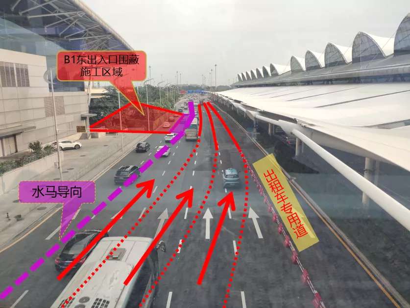 ● 占用一号航站楼B到达区B2-B4门对开的机场大道西部分车道围蔽施工。为保障机场大道西交通顺畅,现场将保留至少3条社会车道和1条出租车专用道通行。