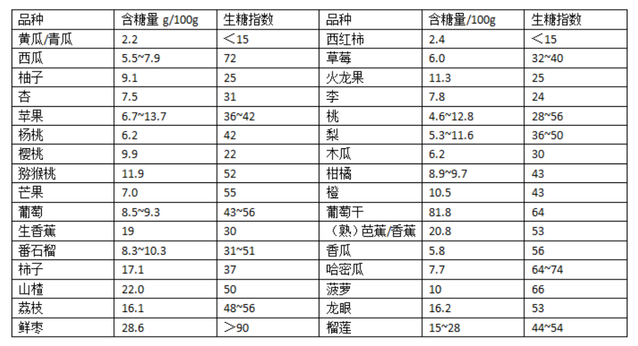 简小兵介绍,在回答患者能不能吃水果的问题前,首先要了解不同水果的含糖量(见如下表格)。其中升糖指数反映了进食不同食物之后2小时内血糖变化的速度和幅度。食物的升糖指数越高,代表这种食物对人体血糖的影响越接近葡萄糖,就是对升高血糖的作用越强;升糖指数越低,代表这种食物对人体血糖的影响越比不上葡萄糖,就是对升高血糖的作用越弱。