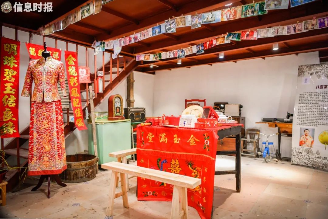 这里呈现了20个世纪30年代至今与婚庆仪式有关的历史图片、用品、饰品等,诸如老式录音机、洗衣机、缝纫机,过大礼使用的饼盒,开脸用的棉线,上头使用的梳子、镜子,女子穿着的嫁衣、携带的嫁妆等,呈现了一幅生动的婚俗历史变迁图。