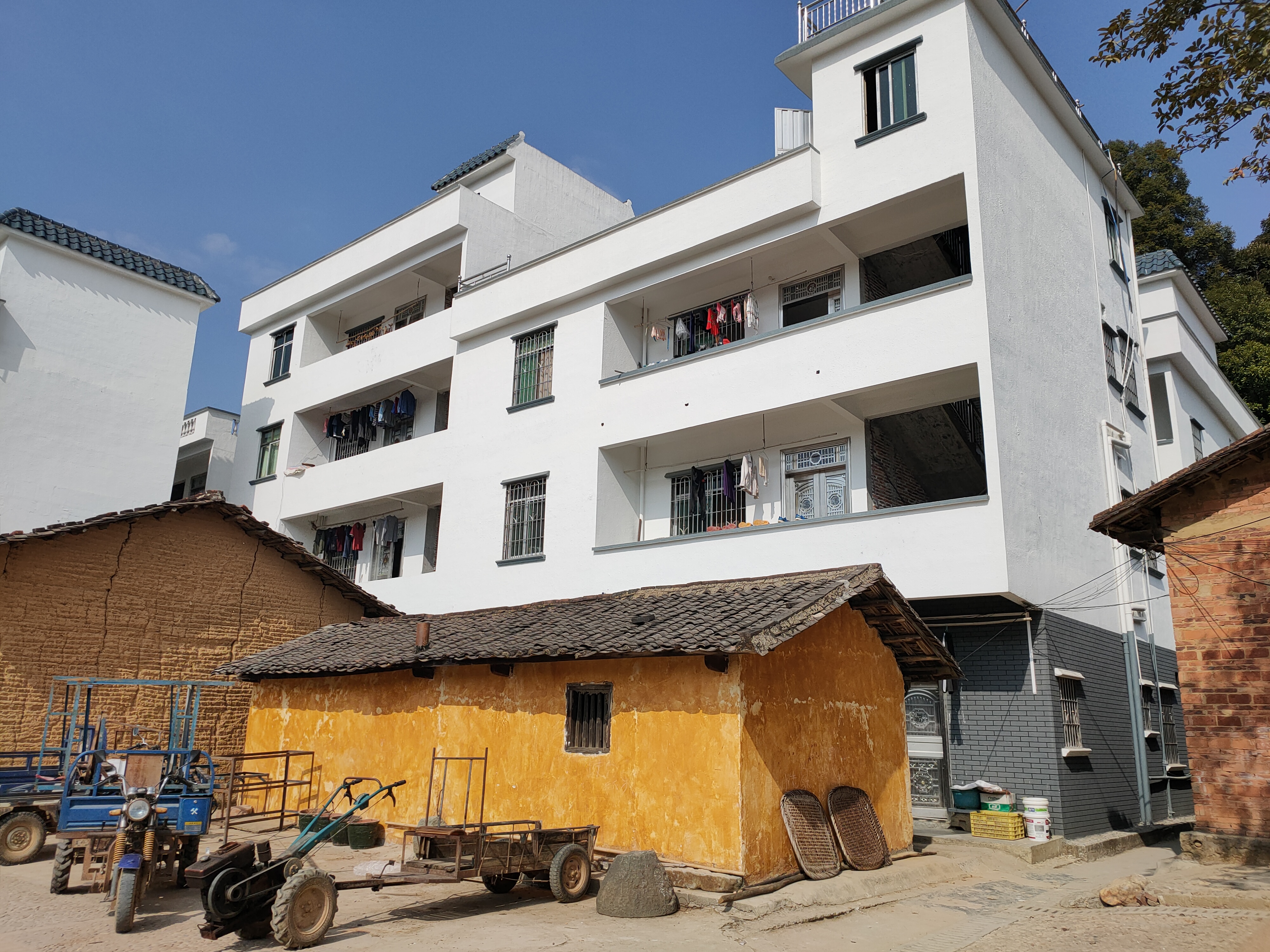 陆奕和现在居住的新民居与前面的旧泥砖屋形成鲜明对比