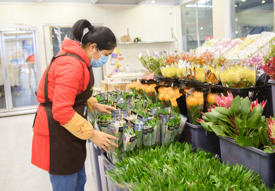 “我们市场今年2月22日正式复市,是广州市第一批复市的专业市场之一。但由于错过了情人节,复市后初期销量仅为同期三成左右。”五眼桥经济联社党总支副书记、岭南花卉市场总经理王艳珊表示,事实上,春节过后,紧接着几个月是情人节、清明节、母亲节,线下销售恢复缓慢,很多花都压在田里卖不出。而鲜切花保鲜期一周时间,作为全国一级市场,后面还有二级、三级等市场,因此对时效性的要求格外高。