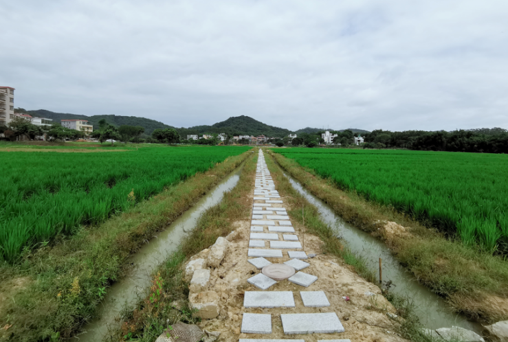 日暮渐沉,一行白鹭划破天空,金色的夕阳顺着潺潺的渠水淌过水车,辗转流进了一望无际的稻田,为坐落在黄埔区龙湖街九龙大道东侧的迳下村增添了一股静谧的氛围。