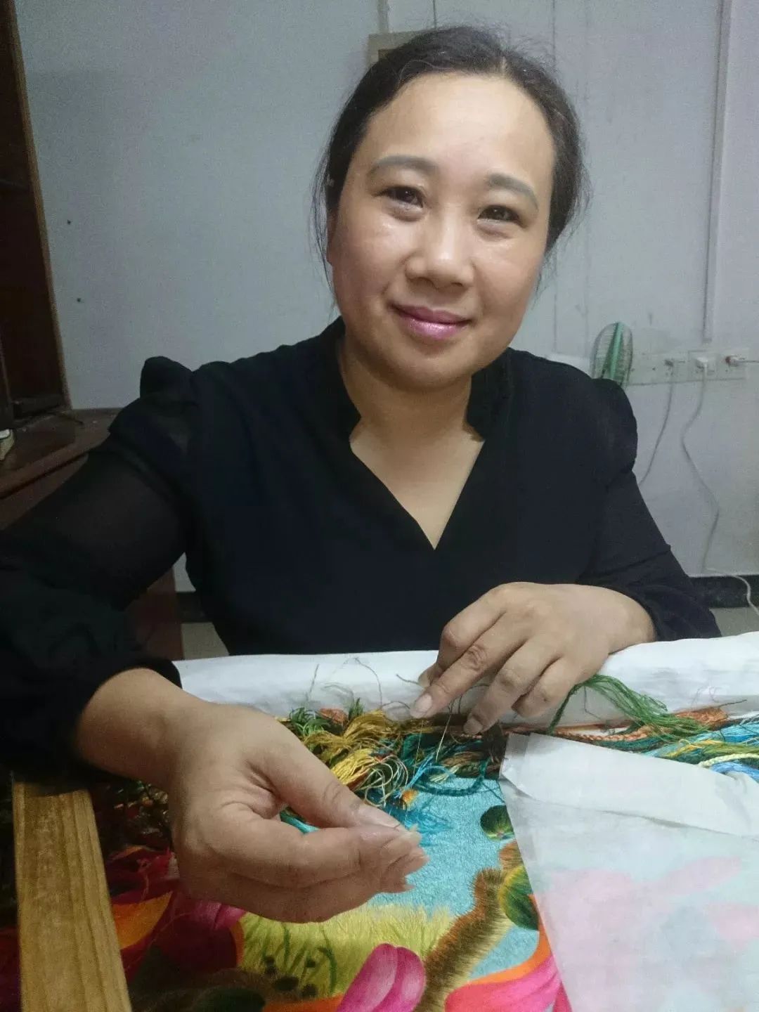 李敏是广绣市级非遗传承人,也是我区广绣国家级非遗传承人陈少芳大师的儿媳。她的女儿谭靖榆也是广绣从业者,一家三代薪火相传。
